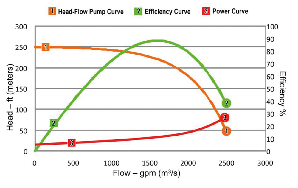This discussion is limited to the most common pumps in industrial and commercial applications– centrifugal pumps. The performance curves in Figure 1 illustrate how the parameters of head, flow rate, efficiency and power relate to one another for a typical centrifugal pump. Note that as head increases, flow decreases, and vice versa (Head-Flow Pump Curve, Figure 1).